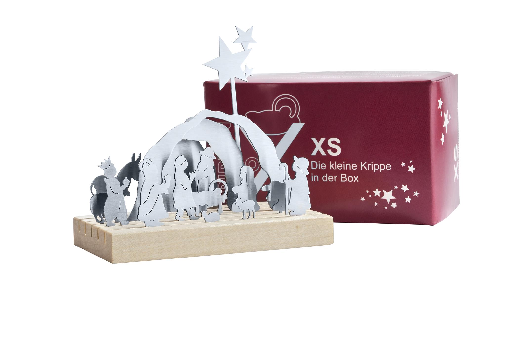 Grundplatte ca. 95x57x12 mm (BxTxH) aus Ahorn geölt, 16-tlg Satz Krippenfiguren aus Edelstahl, Dekorative Aufbewahrung- und Geschenkbox